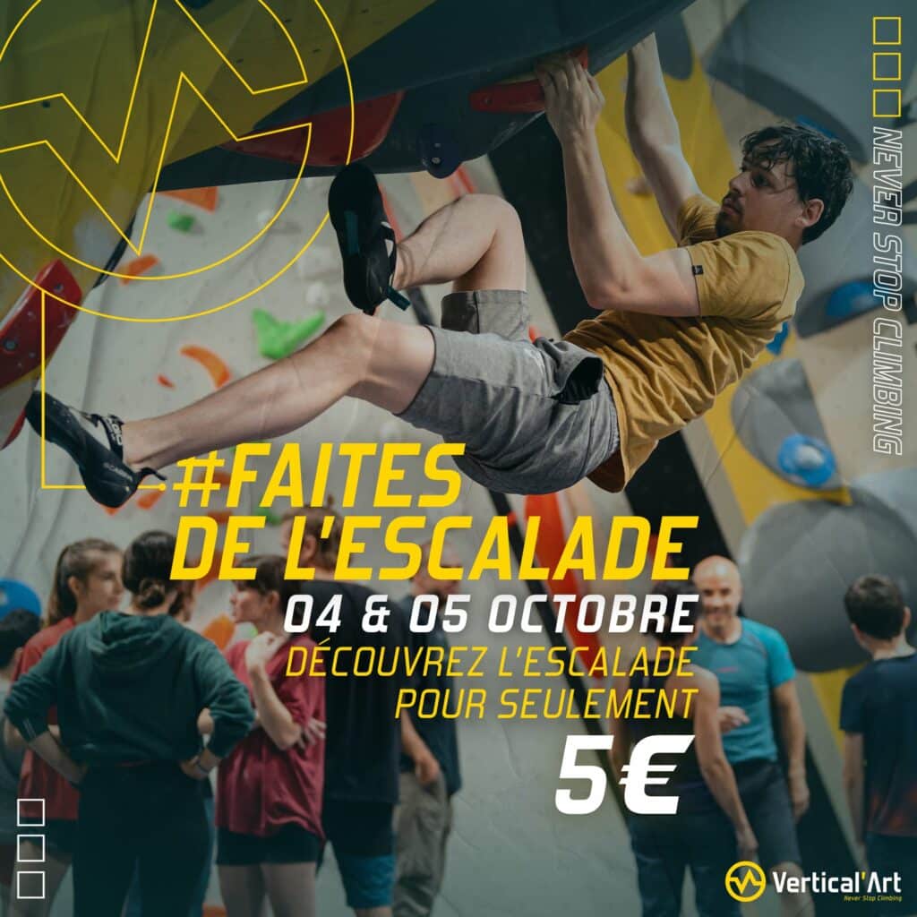 Nombreux sont les françaises et français à avoir été fasciné par l’escalade lors des Jeux Olympiques de Paris. Les 4 et 5 octobre prochains, Vertical’Art Toulon vous donne la possibilité de venir pratiquer par vous même l’escalade de bloc lors de la « Faites de l’Escalade« , organisée en partenariat avec l’Union des Salles d’Escalade (UDSE). Pour la deuxième année consécutive, votre salle de bloc méditerranéenne vous ouvre ses portes à l’occasion de cet événement incontournable, et vous propose de découvrir ou redécouvrir l’escalade pour seulement 5€, prêt de chaussons d’escalade compris !